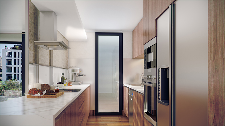 Características y terminaciones: cocina con cubierta de cuarzo y luces led, equipada con encimera vitrocerámica, horno eléctrico y campana FDV. Walk-in closet con espacios diseñados para hombres y mujeres. Cubiertas de baño de mármol carrara y principal con ducha in situ y rainshower.