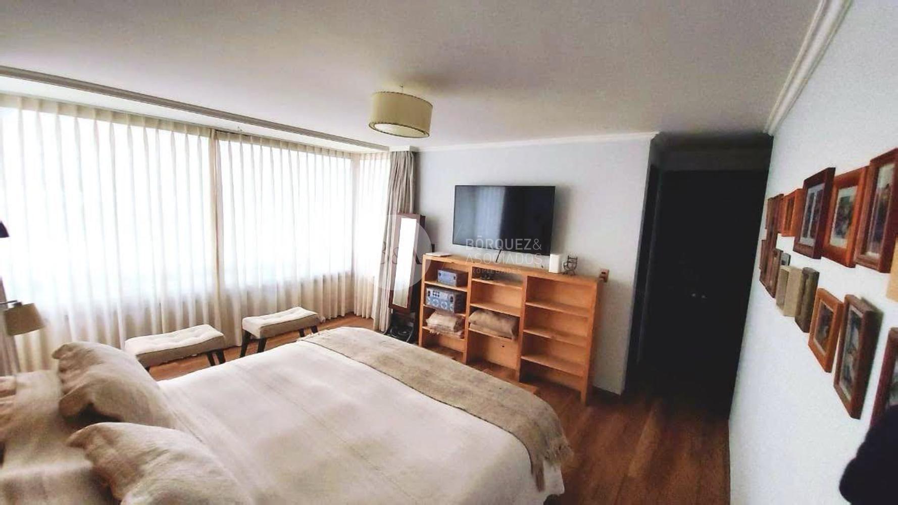 Dormitorio principal en suite con ventanas de termopanel que ofrecen una vista despejada. El departamento tiene piso flotante y mallas de seguridad en todas sus ventanas.