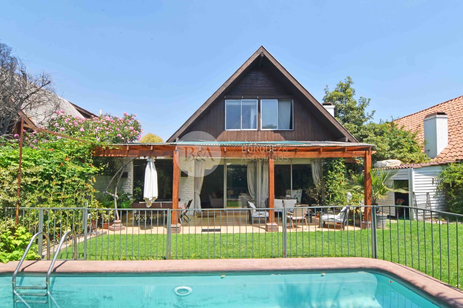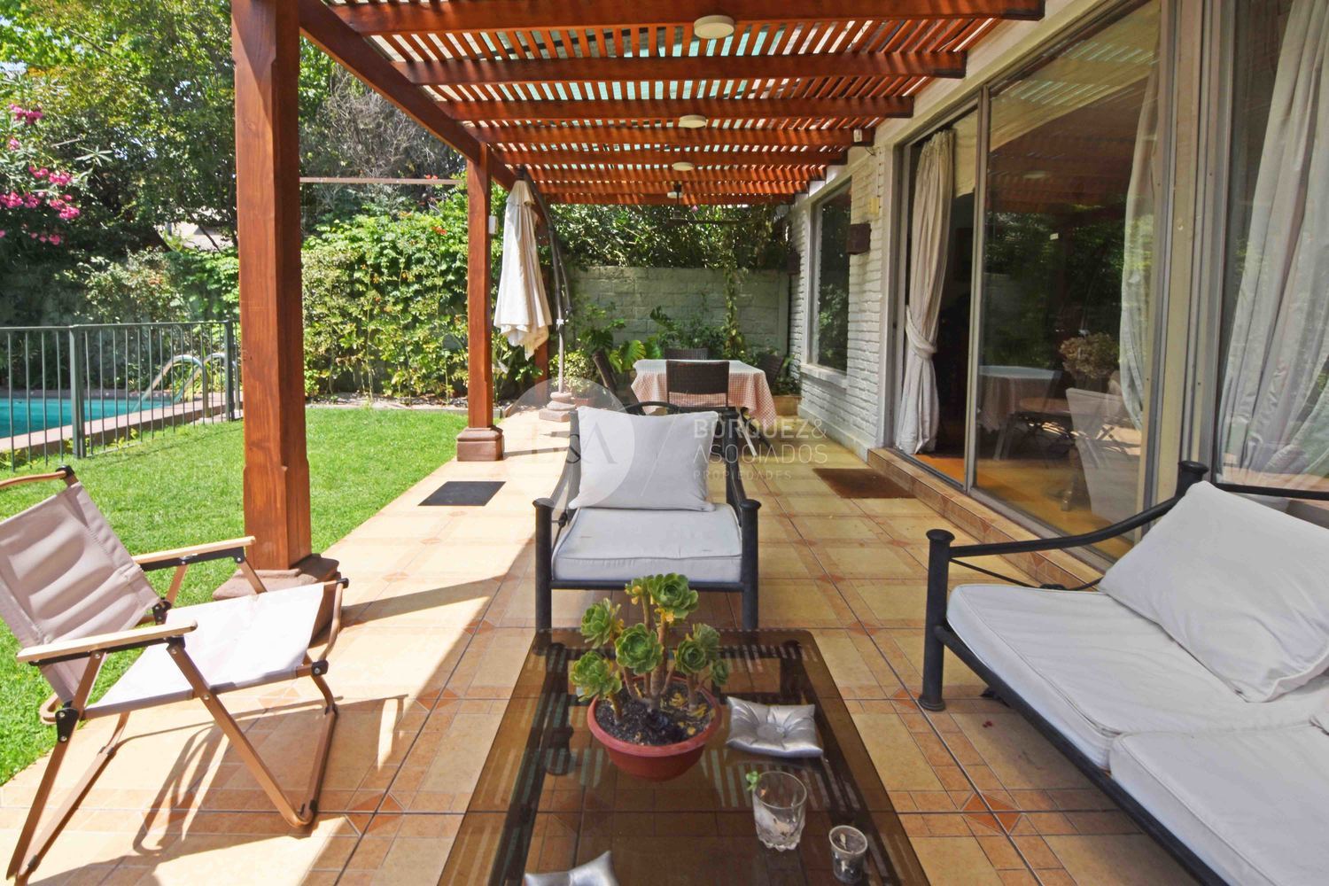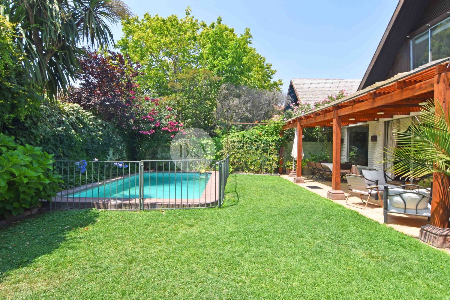Casa con muy buena distribución, en primer piso, hall de acceso, gran living comedor con acceso a amplia terraza con lindo jardín formado con piscina. Dormitorio principal en suite con amplios closets. Cocina de muy buen tamaño completamente amoblada y equipada con dos encimeras a gas, campanas, horno eléctrico y comedor de diario. Dormitorio y baño de servicio muy amplios y logia.