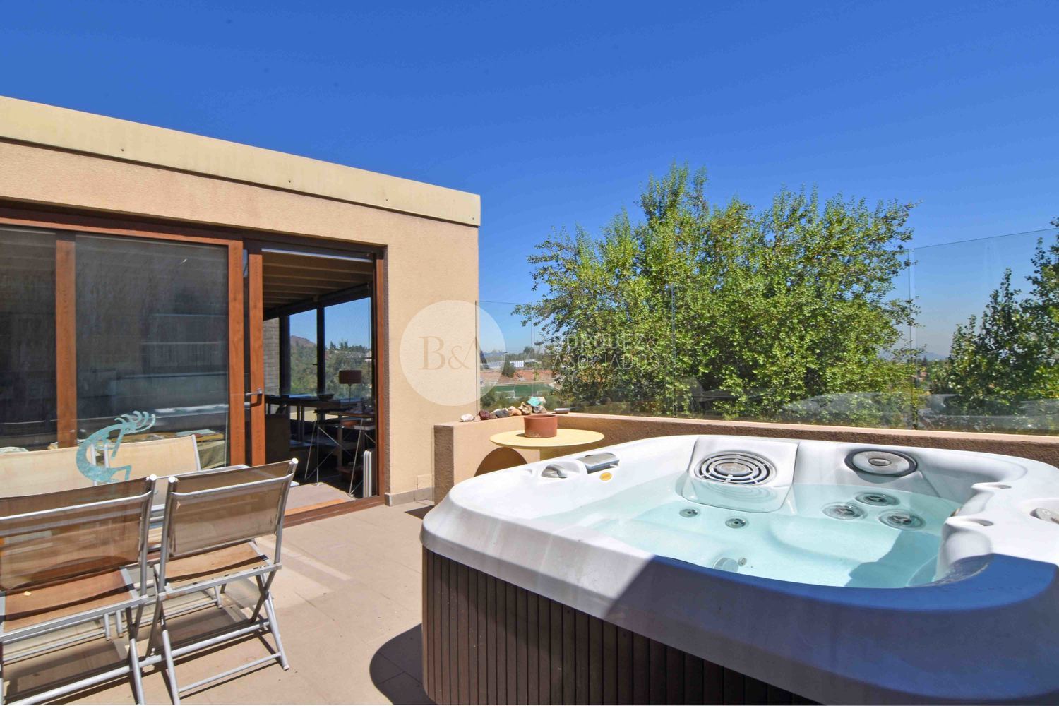 Hall de acceso con baño de visita, living y comedor con salida a espaciosa terraza con vista despejada, desde donde se accede a una terraza superior con jacuzzi y una gran sala de estar con kitchenette.