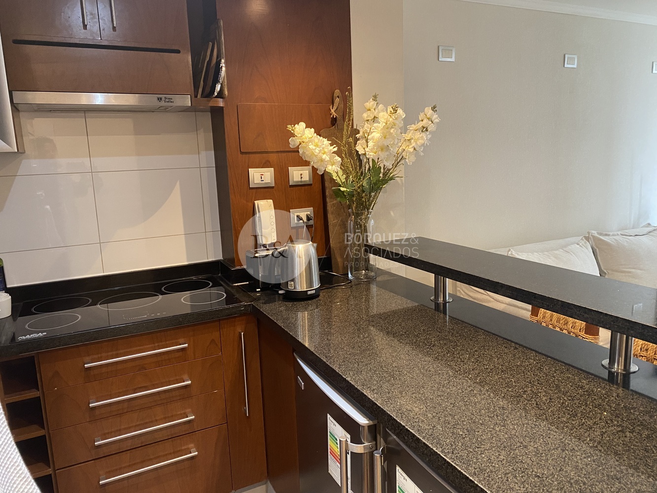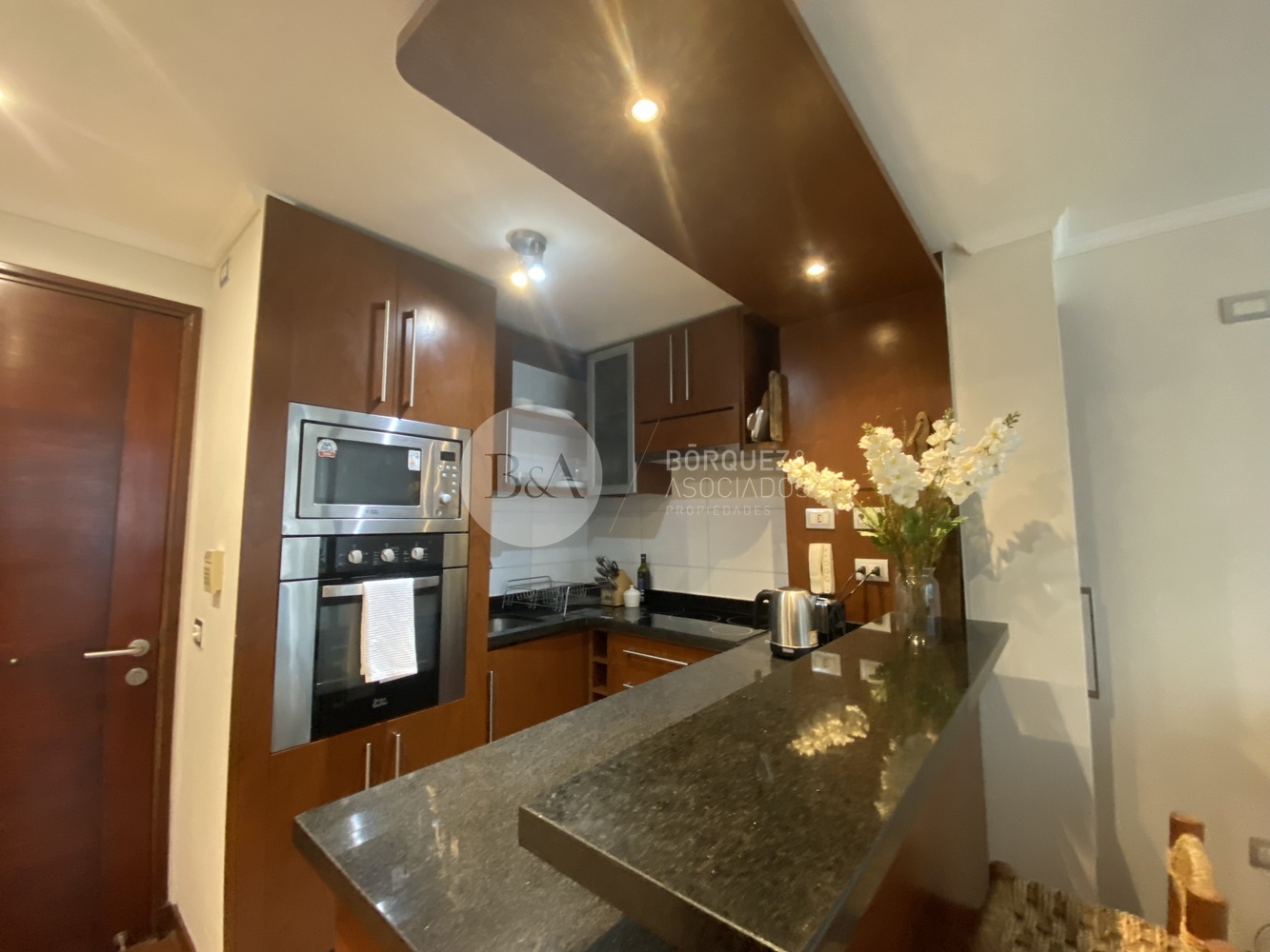Cocina amoblada y equipada con refrigerador, frezzer, encimera con campana, horno eléctrico empotrado y microndas. Mesa en obra que sirve para cocinar y también como comedor. Salida para lavadora o para lavavajillas .