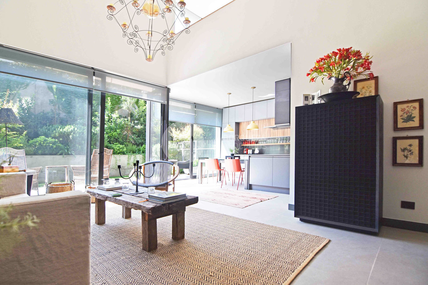 Hall de entrada, espectacular living, con doble altura y salida a una rica terraza con jardin formado, con riego automatico, un baño de visitas .