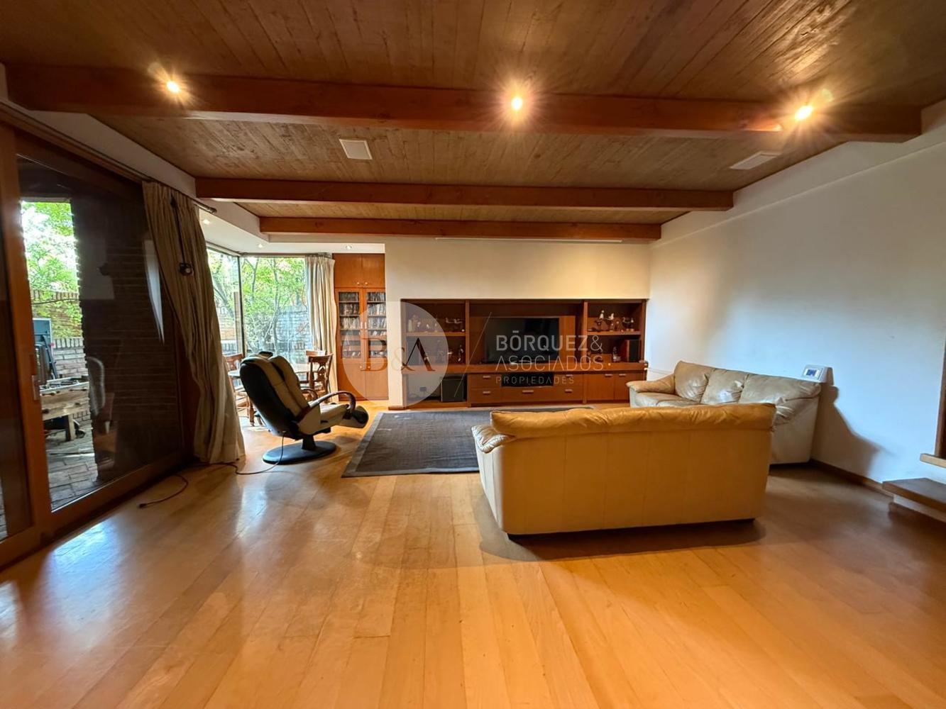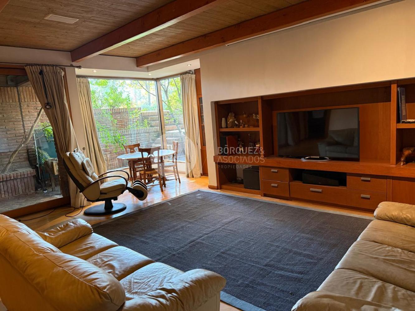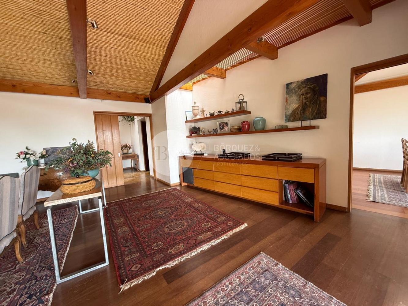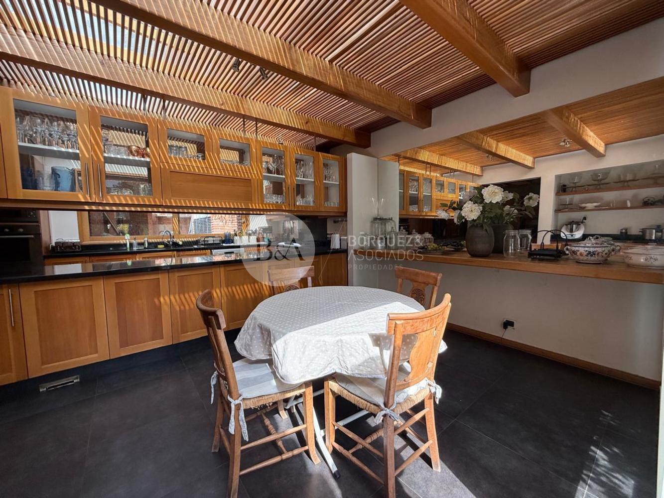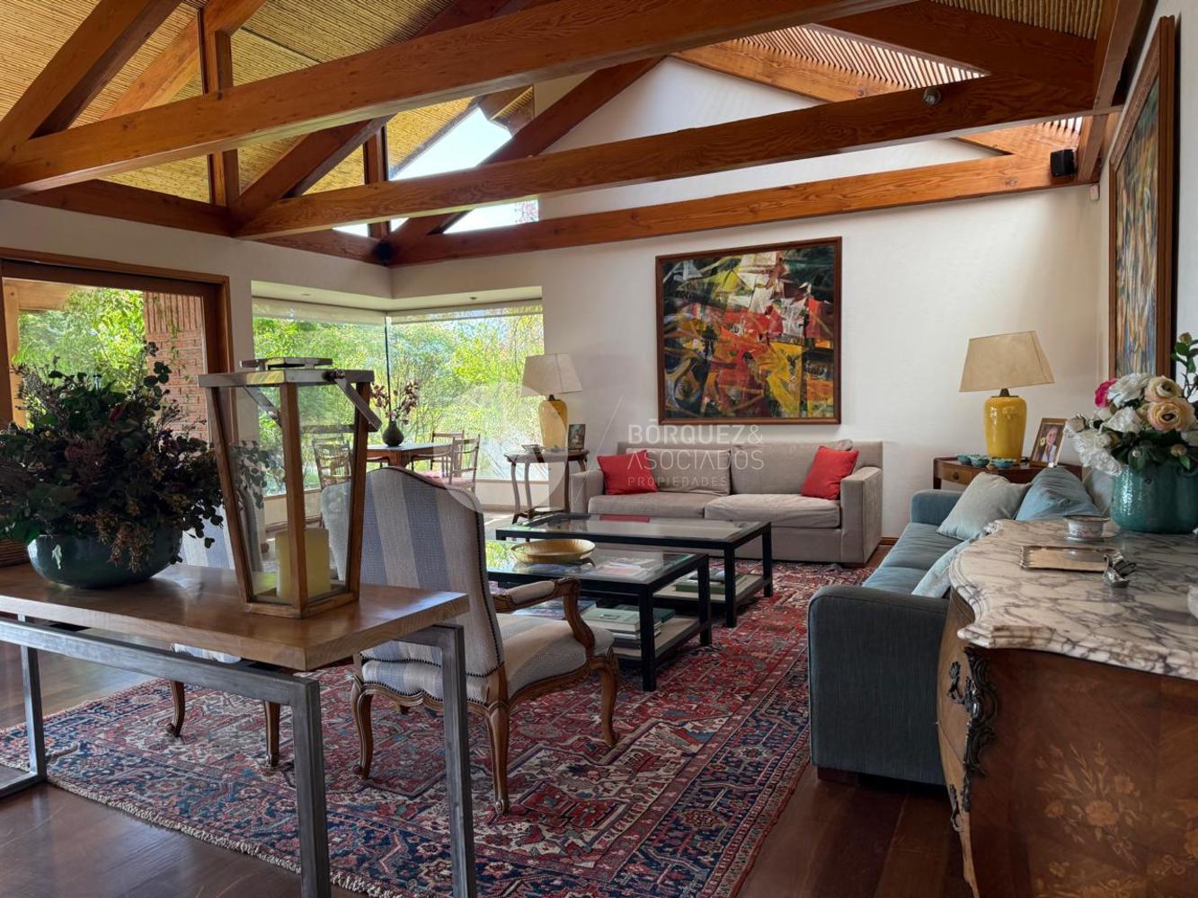 Cuenta con hall de entrada de doble altura, living y comedor separados con techo de bambú, ambos con salida a una gran terraza techada y jardín formado. Los ventanales se abren completamente, integrando los espacios. Además, tiene quincho techado.