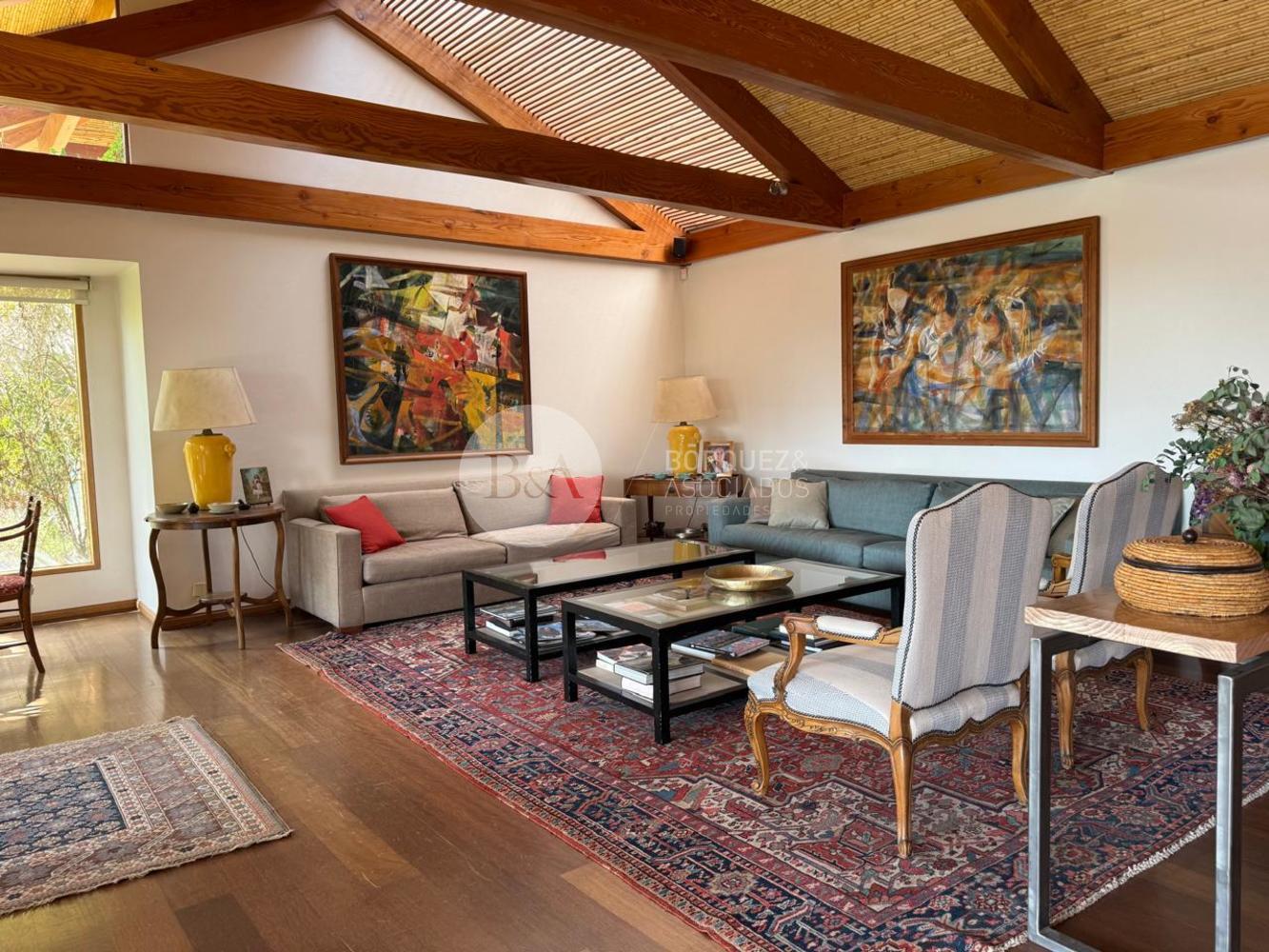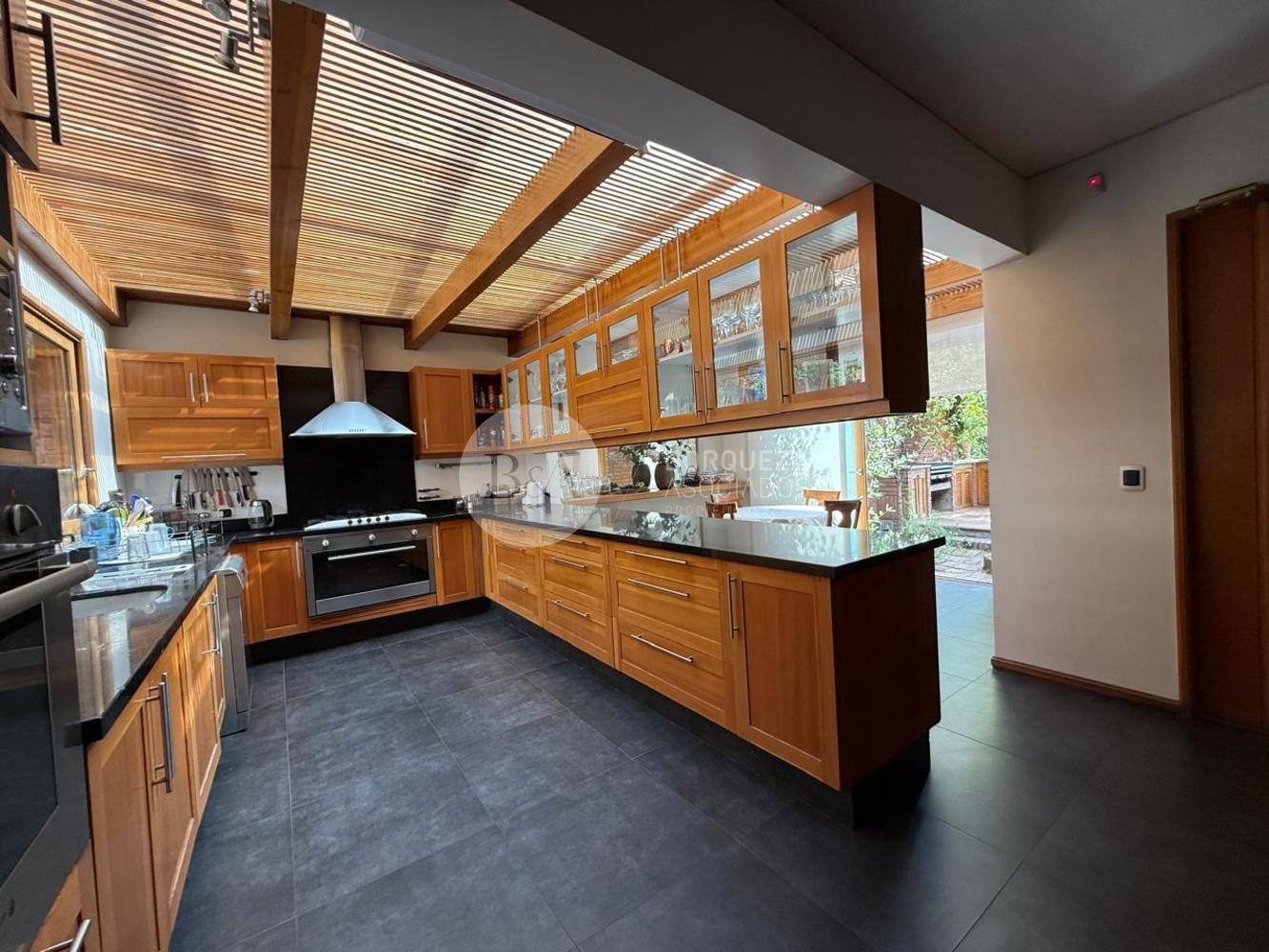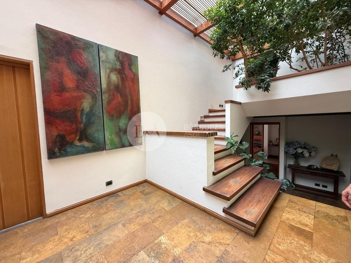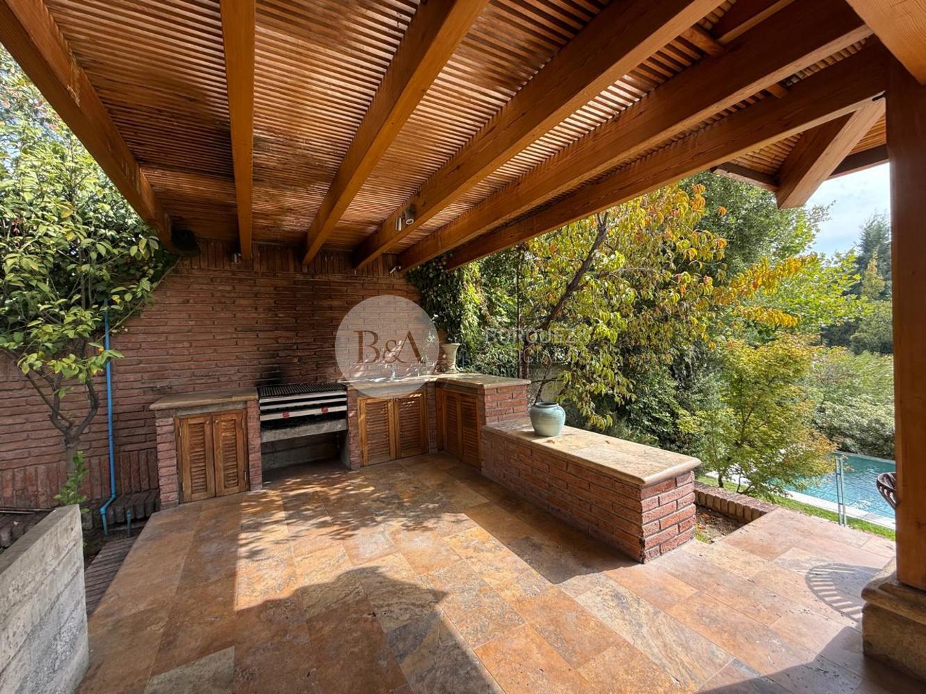 Cuenta con hall de entrada de doble altura, living y comedor separados con techo de bambú, ambos con salida a una gran terraza techada y jardín formado. Los ventanales se abren completamente, integrando los espacios. Además, tiene quincho techado.